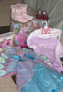 Ok, so, the picture at left is the pile of STUFF that I'm supposed to be wrapping right now. Those are the gifts from "Santa", mom and dad. The pile doesn't have the Leapster game that I already wrapped or the Barbie "Island Princess" doll we got her AND Tikka (the Island Princess's elephant and sidekick). The big thing in the back is also part of the Island Princess STUFF and has a vanity, a free standing screen/backdrop, a tea set, the little monkey from the show - the packaging boasts "OVER 20+ PLAY PIECES". The big peacock looking thing that's laying down is a dress just like Barbie's "big scene" costume in the Island Princess DVD that her Dad got her a few weeks ago. Now, here's where the confession rolls in... for those who don't know me personally you probably don't know that I have an aversion to all things Barbie and think that they are inappropriate for little girls... kind of like guns for boys... not really the stereo type I would like to smear all over my kid. And then I get out into the shopping crowd with my mom and I LOST MY MIND!!! The rest of the schwagg is all stuff that I can see me getting her... sparkley red ballet flats, pink faux Uggs, 2 pair of jammies and a baby digital camera. I'm overboard but still inside my body when I pick those things. Clearly, I should NOT be allowed out. When I pulled it all out to wrap I thought, I have to record this pile somewhere before its dispersed.